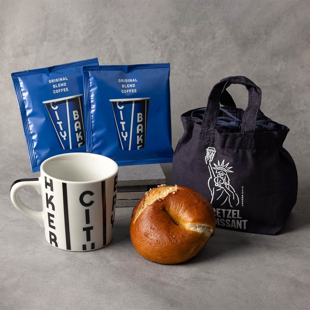 内容:ドリップバッグコーヒー×2、マグカップ(Mサイズ・カラーBK)×1、プレッツェルベーグル×1、巾着ミニバッグ(ネイビー)×1