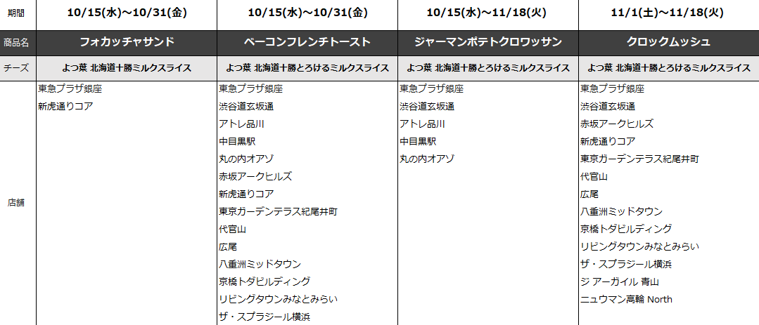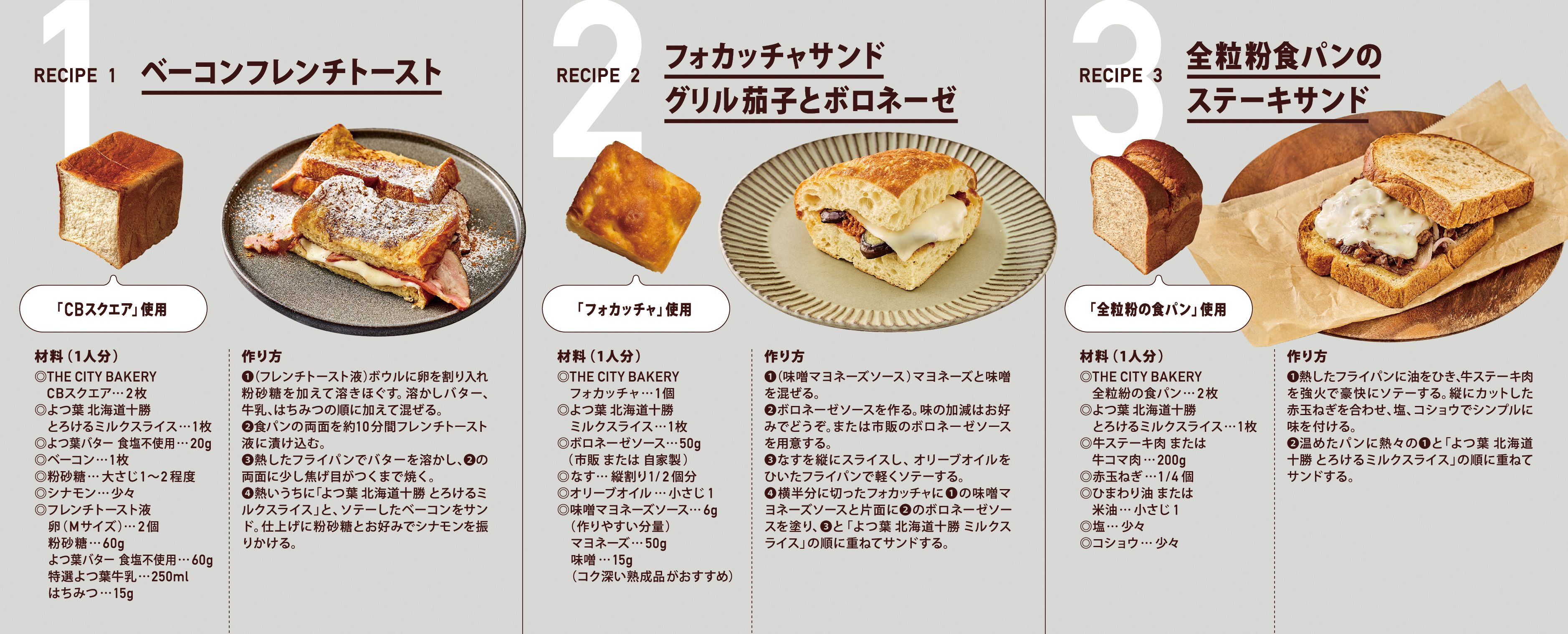 THE CITY BAKERYの「食事パン」は、各地のベーカーたちが粉を選び、その日の気温や湿度に合わせて酵母や水の配合を調整、丁寧に焼き上げています。そして、この食事パンの生地は THE CITY BAKERY で人気のペイストリーにもベースとして使われています。確かな技術を持つ職人が材料と製法にこだわり作り上げた「食事パン」と、素材にまっすぐに向き合った「よつ葉 北海道十勝ミルクスライス」シリーズを使い、毎日の食卓に寄り添うチーズ&パンアレンジレシピを考案しました。お馴染みの「食事パン」の新たな美味しさを、ぜひ発見してみてください!